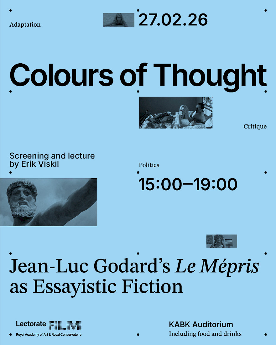 One of the core questions of the Lectorate FILM is how moving-image practices can be deployed as a mode of research. How do we use the camera as a pen? In what ways can we employ editing to generate insight into issues and situations? In this lecture we will examine how Jean-Luc Godard, who regarded himself as an essayist filmmaker, mobilised colour not merely to create atmosphere or produce meaning, but to interrogate a concept and approach an understanding of what it entails. He wanted to know what ‘contempt' is.