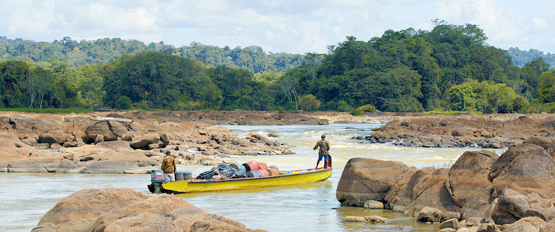The story of Boogie —a Ndyuka Maroon boatman struggling to juggle his traditional responsibilities with the pressures of a money-driven world—unfolds in a forested landscape ravaged by climate upheaval and pollution from gold mining. Boogie is our guide along the winding rivers, inviting us to drift through the rivers of his thoughts. He shares his role as narrator with those he meets along the way, singing and speaking in their own tongues about the struggles of their communities.