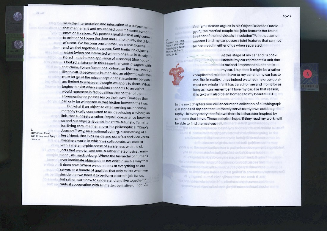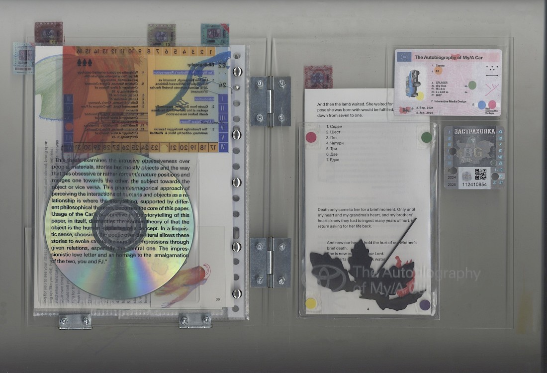 - Nadia Abadjieva’s thesis The Autobiography of My/A Car examines the intrusive obsessiveness over people, materials, stories but mostly objects and the way that this obsessive or rather romantic nature positions and merges one towards the other, the subject towards the object and vice versa. This phantasmagorical approach of perceiving the interactions of humans and objects as a relationship is where the storytelling, supported by different philosophical theories, becomes the core of this paper. Usage if the Car's perspective in the storytelling of this paper, in itself, dismantles the Kantian theory of that the object is the human appliance of a concept. In a linguistic sense, choosing the poetic over the literal allows these stories to evoke strong feelings and impressions through given relations, especially the central one. The impressionistic love letter and the homage to the amalgamation of the two, you and FJ. (abstract written by Luka Boduljak)