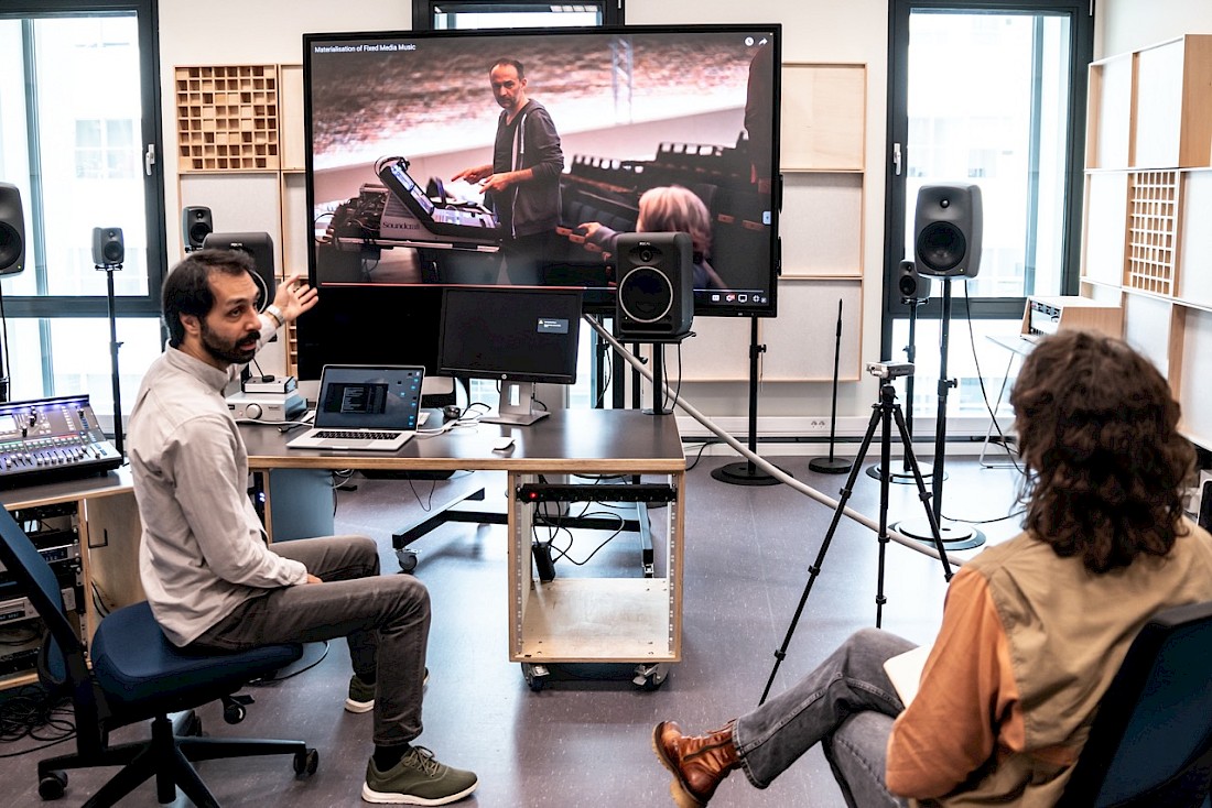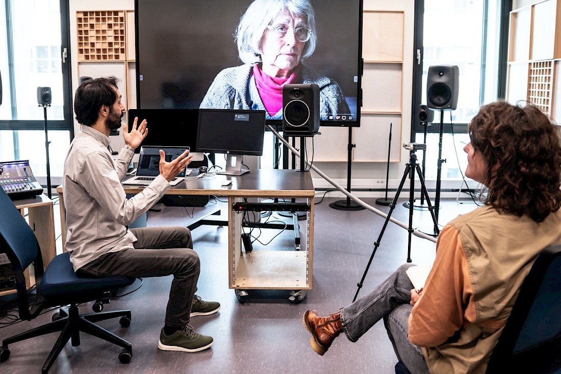 For example, at the beginning, I was more interested in how the fingers are working on the mixing desk moving the faders during a performance, which is of course very important. Later on, I realised there are other interesting things going on in the concert hall. I started to film the whole concert situation, including the audience and their reactions. This allowed me to better understand how people listen to that kind of music, and to realise that not everyone closes their eyes and sits still. Besides this observational material, I interviewed a number of experts in the field to get some first-hand information on how different composers deal with the issues that I was investigating. For instance, I met the well-known electroacoustic composer Beatriz Ferreyra (86) and documented her approach to preparing and performing her music in a concert hall in Berlin. I followed her and recorded her soundcheck and the actual concert. It was very interesting to go through all these steps with her. She's quite modest about what she does, but I was there and experienced her performance, which was amazing. Besides that, I also interviewed her and discussed the issues around composing and performing fixed media music with her. I also interviewed other composers who have different approaches, and documented the practice of some of them in order to establish a discourse between them.
