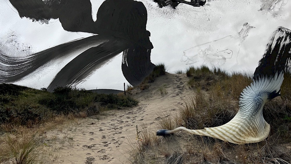 Sophie van Romburgh: Lecture-performance that investigates conversations between materiality and experience in my walks (trails, rhythms, the sand in my shoes), drawings (ink, brush, paper, seawater, gestures), a medieval riddle poem and text-to-image AI, and a 17th-century scholar’s live imaginings of words.