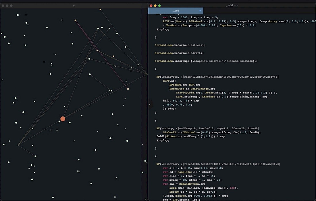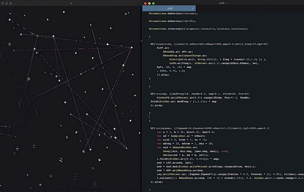 Live-coded synthesis as a mode of composition is what drives many of the possible applications of ‘Striations’. The observer (live-coder) produces rich computer-generated sound where interaction emerges through the inference of the analysis and the treatment of the growing network.