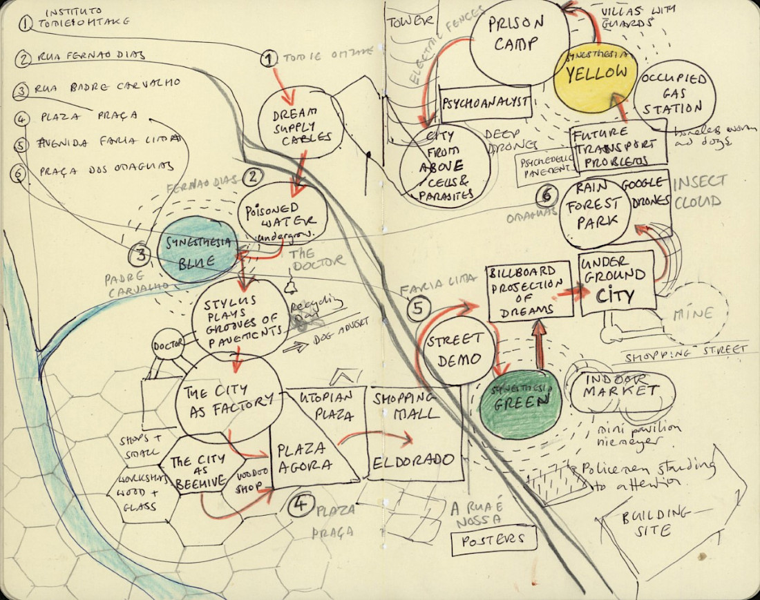 In many of Bennett's works and installations, sound and voice-over are juxtaposed with video images, drawings, maps and diagrams. Thus, a reciprocity is created between various forms of expression: a drawing or a text can be a score; and sound and image become ways of drawing and writing.