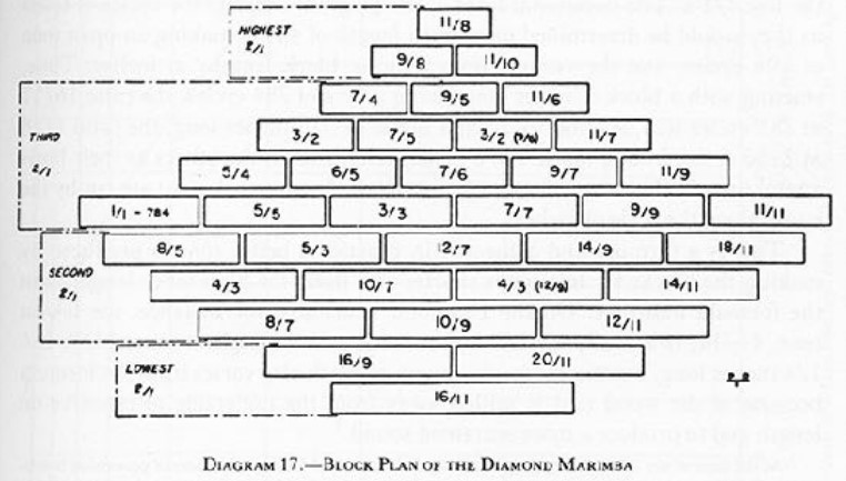 During his life Harry Partch wrote numerous pieces for a growing orchestra of custom build instruments. All instruments were designed to fit a (just intonation) tuning system inspired by the sensation of tone by Hermann von Helmholtz. Many of the instruments were based on the 11-limit tonality diamond. This basis is omnipresent in his music theory but often obscured in the instrumental layout. The diamond marimba is however a big exception. The music theory is physically present in the shape of the instrument.