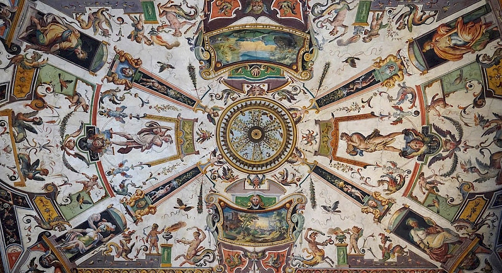 One chapter, now uploaded to the Research Catalogue, is a case study involving documentation and discussion of the process by which Milana Zarić and I produced our composition grottesche, beginning from the ceiling frescos in the Uffizi in Florence (see illustration) and the 17th century multimedia artwork Atalanta fugiens compiled by Michael Maier. This led to the conception and realisation of a duo for harps and electronics which we first performed in March of 2025, and which was then developed over a period of months, in the course of a series of working sessions with the musicians of Ensemble Modelo62, into a composition for eight performers and video, which we premiered in December. The creative process was itself an improvisational composition, so to speak, combining planning and spontaneity in such a way as to suggest many possible pathways for future work as well as further developments of this one. Milana and I will present an excerpt from the duo version in the presentation.