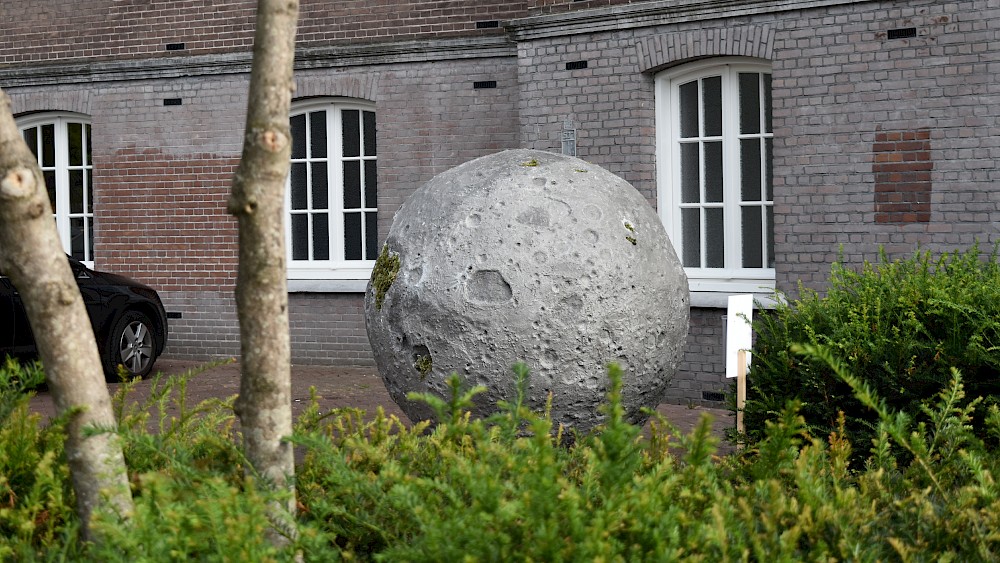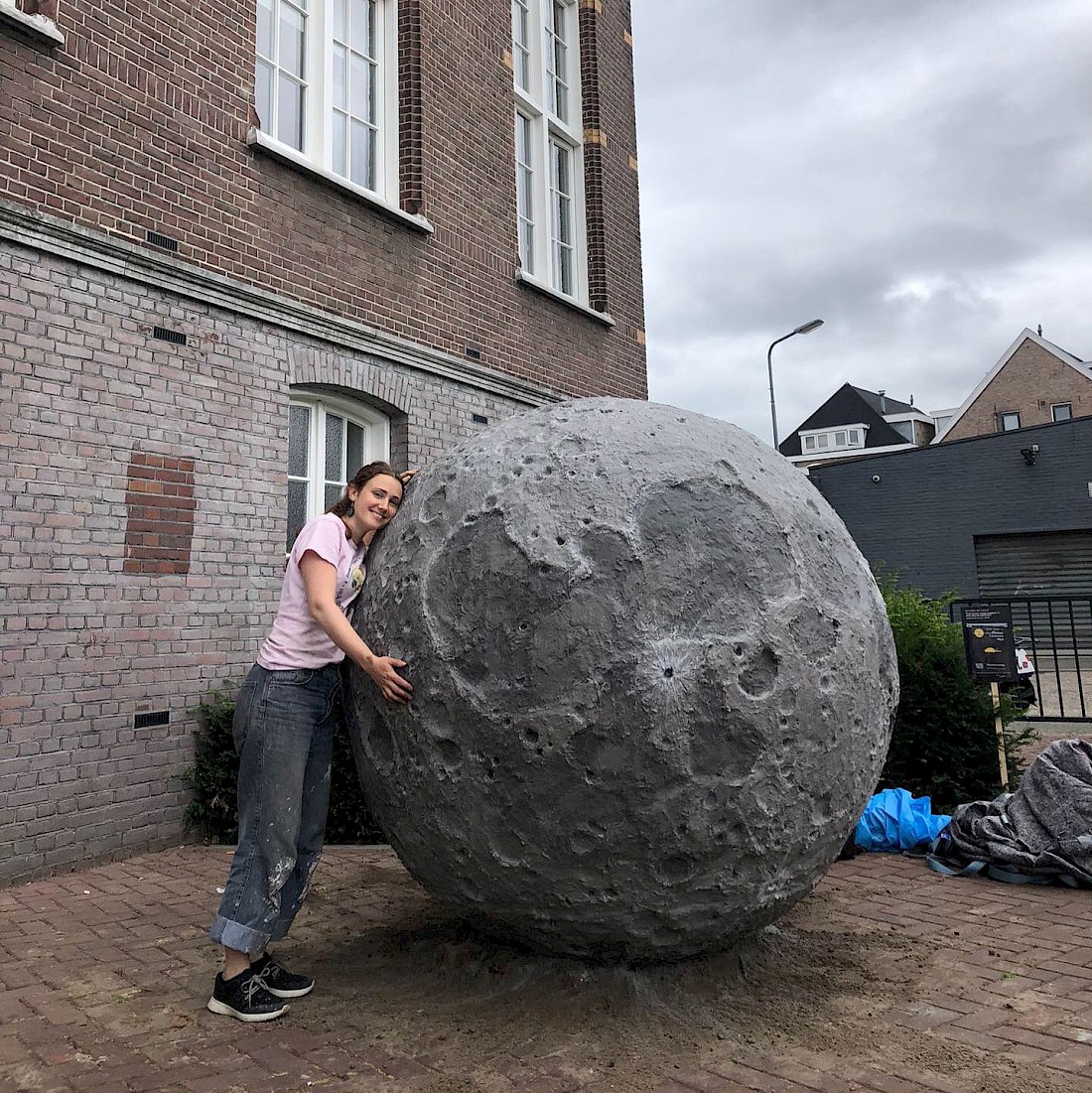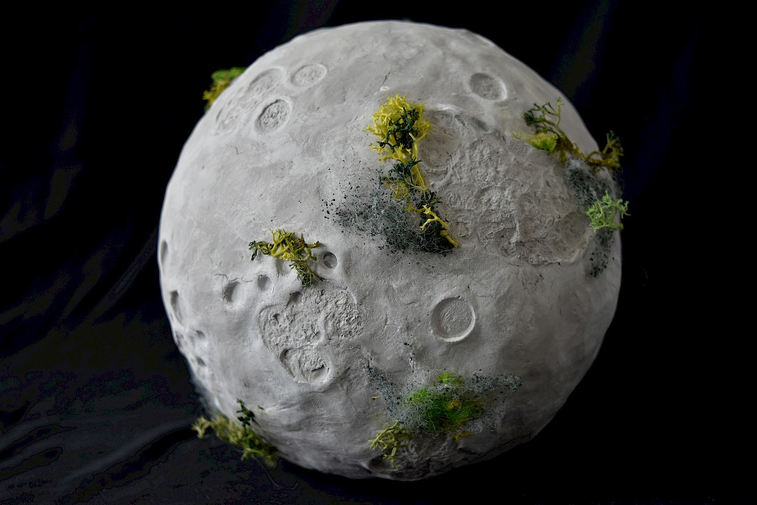 Simultaneously, I continue making material manifestations of certain aspects of the story; in a sense bringing them into reality. The largest of these is my giant moon: The Lunar Moss Piglets in the Sea of Serenity. In my story, In the beginning…, the crash-landing of the spacecraft bursts a spring of water on the moon which allows mosses to grow and tardigrades to thrive in their favourite habitat, moss. My intention by making this giant moon, as well as illustrating a moment from the story, was to offer a kind of reparative gesture for the tardigrades trapped on the moon. To create for them an optimal tardigrade ecosystem for their cousins still on Earth.