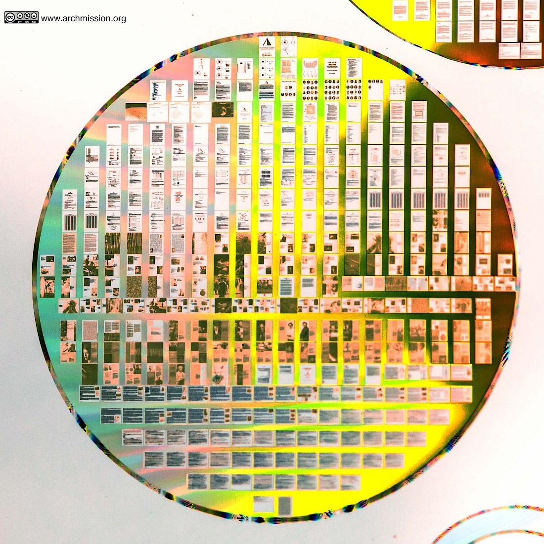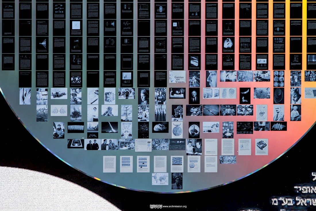 Constructed with nano-technology, the archive was a kind of microscopic library. Letters the size of bacillus bacteria are engraved into small thin sheets of metal, resembling CDs. These disks are piled on top of one another into a kind of tower, readable through a microscope. They are designed to last for billions of years and for future intelligent life to learn about humanity and planet Earth. Within this archive are a selection of the weird, wonderful and problematic. In the white paper made about the project, amongst other things you can find the following items listed: