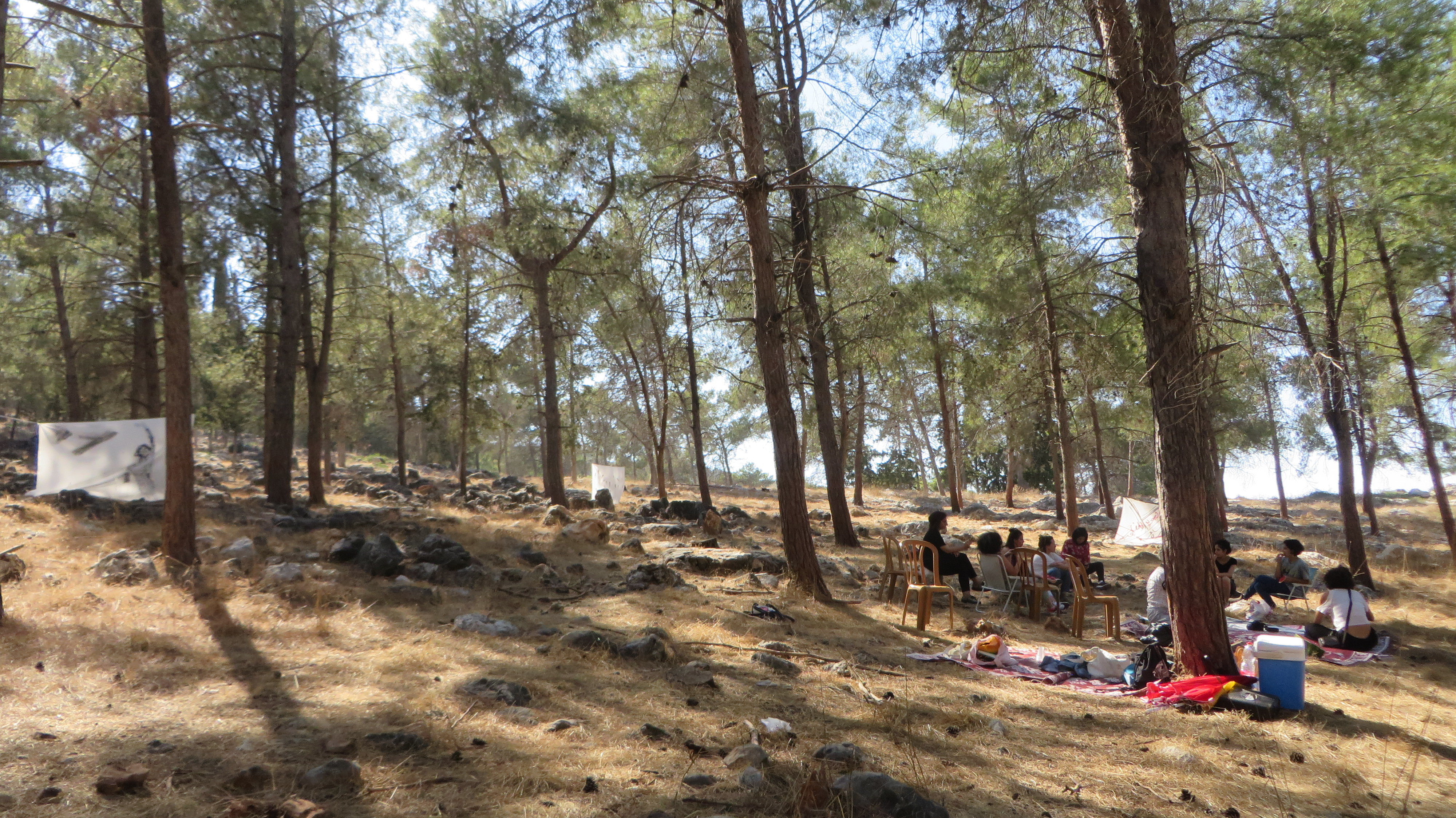I remember being staggered, after I married and moved from another neighborhood to where I currently live, to see that people do not usually go in there, and I thought of how much these public places and nature are unappreciated and wasted. So what Saadah Juhaina, a member of Here and Now group, and I did was mostly a gathering spot in the woods and people who came in could hang around, talk and paint on white big canvases that we hang between the trees around the gathering place, photo of Valeria Gaslev below.