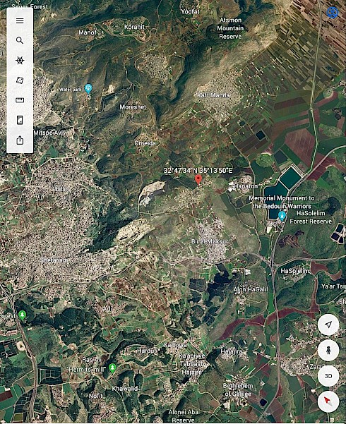 By the second year, I thought about how it is that any form of artistic action, done outside my environment, would only respond to it without making actual change. Thus, combined with the fact that interest in art practice among individuals in my surroundings is close to nothing and the shortage of socializing public spaces, I decided to make use of public woods in my neighborhood, in an attempt to merge that marginal space into ordinary daily activities, since individuals are very detached from public spaces. At that time, I had no historical or political background regarding the woods surrounding the village (on the below map you can see Bir el-Maksour and the neigbours. The red pin marks my neighorhood and the nearby forest.)