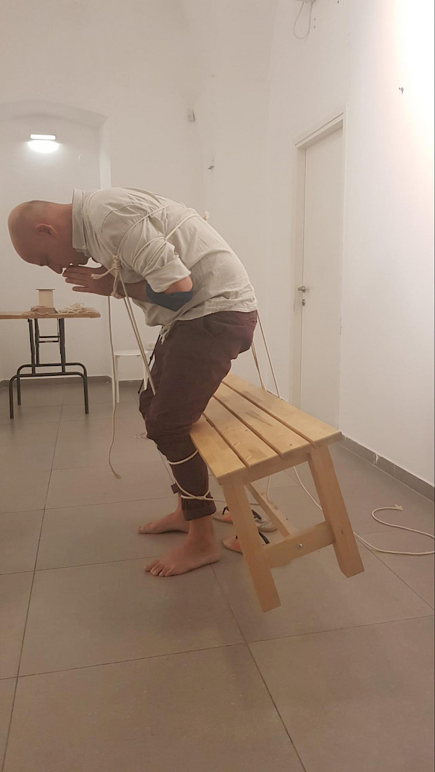 The first year of the program was full of new experiences and encounters with varied ways of action in the art field. Still, I was more focused on responding to the place in which I exist and live in, rather than trying to integrate or change it. Thinking about power relations, restrictions, and control embedded in social construction as ways of living in this complex place we live in, especially in the village I come from, I did a performative action that relies on the participation of the spectators. In which, I arranged a minimal setup with bondage ropes, a table, and two chairs, see photo 1.