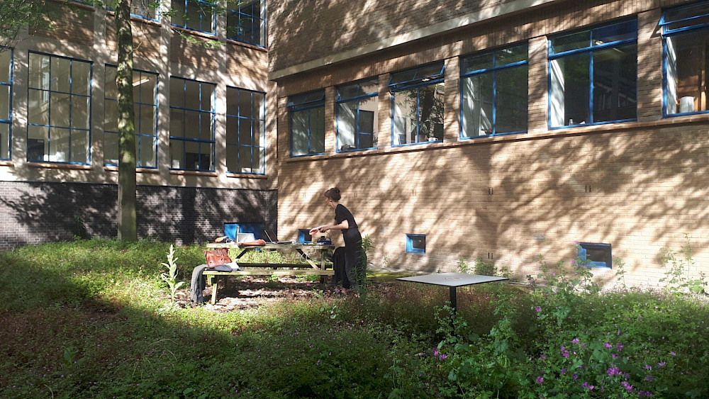 During many journeys around and through the KABK, there was one location that kept drawing my attention, situated both inside the academy and outside the building, the courtyard of Prinsessegracht 4 or the garden space designed by Plantenga, is one of the few locations at the KABK that is not regularly programmed or bookable (except during graduation exhibition) and it is open to all members of the community, students, staff and teachers. The largest, open space of the academy and surrounded completely by windows to corridors and classrooms, a square void of sky, living beings, plants, trees and soil, faced on all four sides by different disciplines and departments, as well as the director and staff offices.