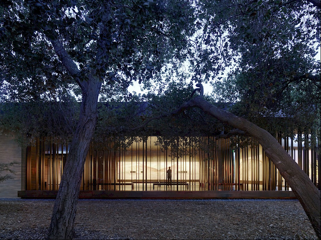 The Windhover Contemplative Centre at Stanford University (USA), Designed in collaboration with Andrea Cochran Landscape Architecture, is a ‘spiritual retreat' on the Stanford campus, with “rammed earth walls, wood surfaces, and water [to] heighten the visitor's sensory experience acoustically, tactilely, olfactorily, and visually." [4]