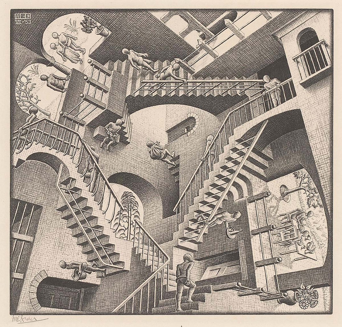 In June 2021, walking through the monumental building of the KABK, where I teach at the Interactive/Design/Media department, ones vision unfolds endlessly across the reflective hard surfaces, tiled staircases and corridors. The image of ‘Relativity’ (1953), by the Dutch artist M. C. Escher comes to mind and incidentally can be viewed a few streets away, at The Escher Museum, Het Paleis.