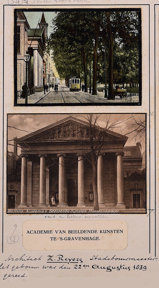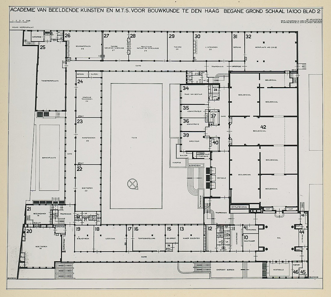 The KABK building has developed over the centuries along with the needs of its community and the contemporary culture of the time. Moving through neoclassical columns of the original Prinsessegracht building, built in 1839 and designed by The Hague city architect Zeger Reyers. Demolished just 100 years later and reconstructed between1934-1937 into a new design by KABK director and architect dr. ir. JH Plantenga. This building, which still stands today at Prinsengracht 4, was envisioned to facilitate a modern, Bauhaus influenced art and design education, bringing together art, design and craft into one academy. With its lucid NW facing windows, filtering north sea light into the painting studios, we see the organisation of art and design disciplines positioned in discrete departments, subsequently forming the organisation of the building, the community and the curriculum. A legacy that still operates today.