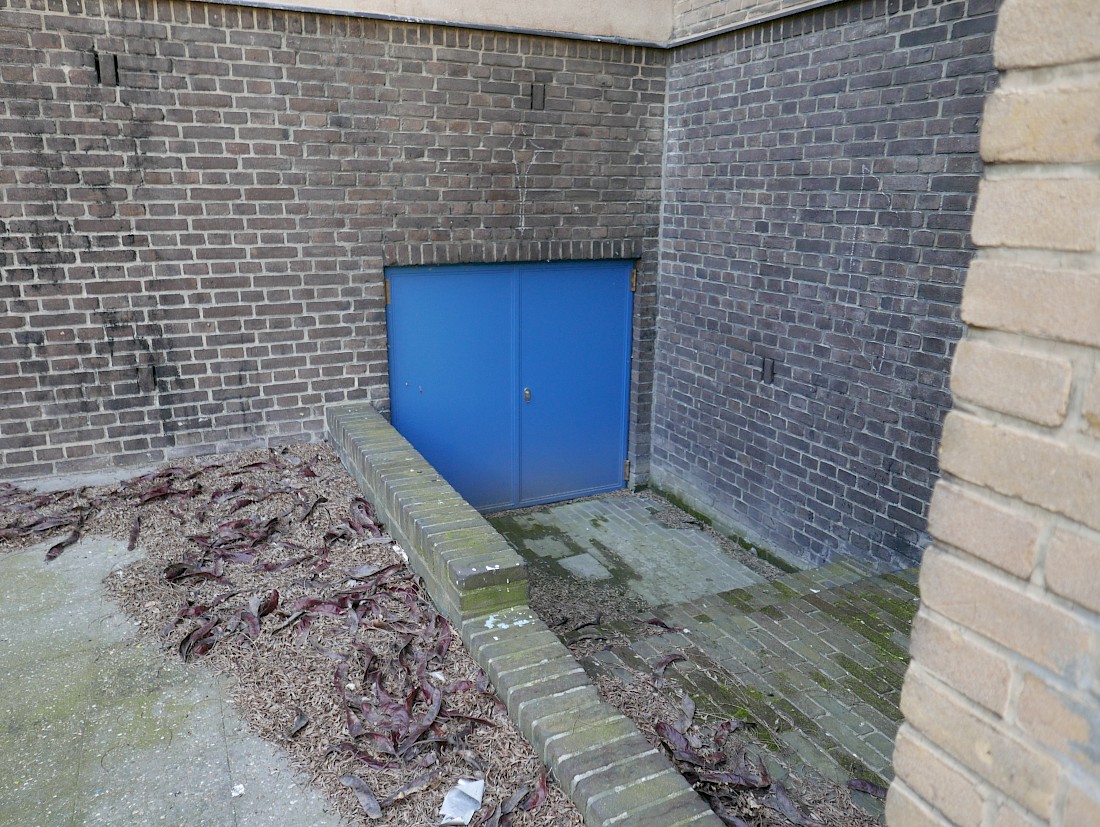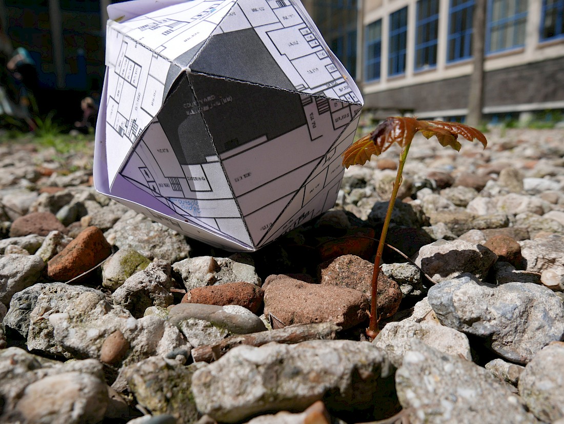 The process that follows, leads me to follow the path of the wind, to a pile of Acacia seed husks, worn down by the North Sea wind, and pushed up against the coldest corner of the courtyard that receives the cool, fresh morning sun. The edge of the seed pile leads the eye to a KABK-blue, small metal door, with a cold steel handle. Walking down the red brick steps to the basement level, where the space behind the door occupies, I turn the handle, its tight lock invites curiosity - where does this door lead I wonder? Back up to ground level, the eye is distracted by a rolling hexagonal prism, seriously! More curious still, the surface of this white cardboard object is imprinted with the architectural floor plan of the KABK, I am not alone I think with a smile, as the untold stories begin to reveal themselves…