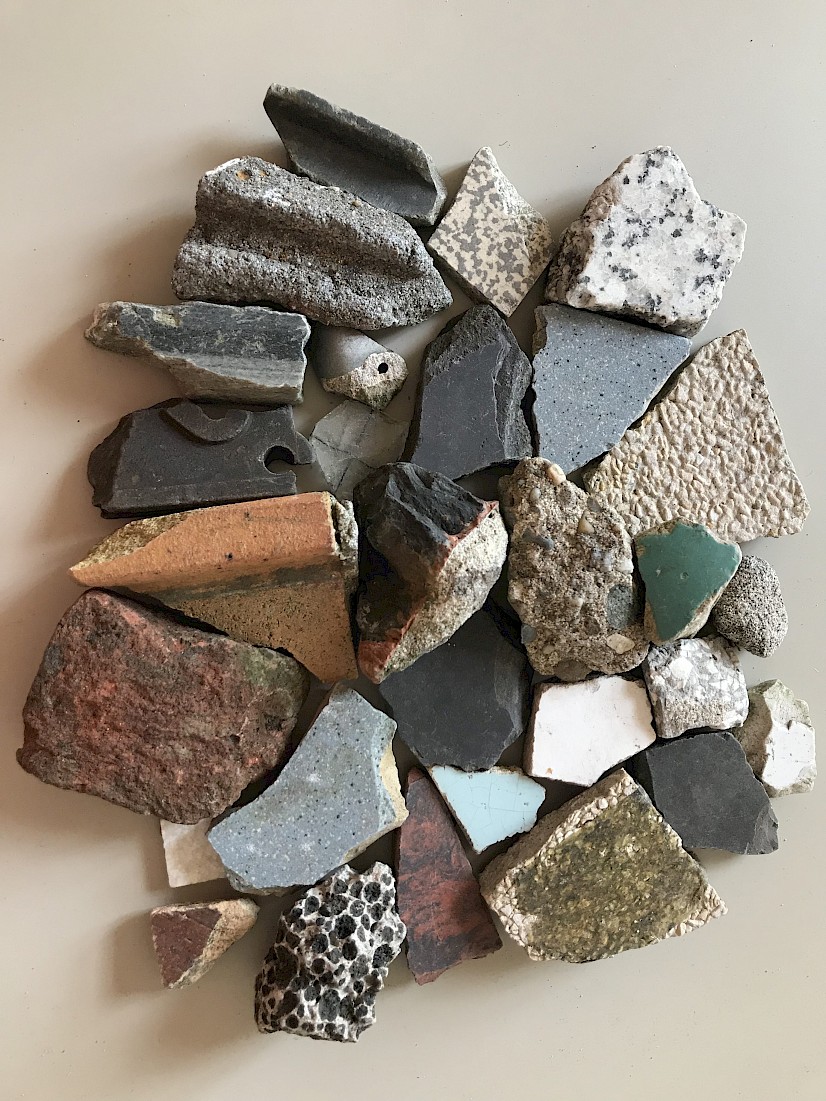 Squatting on the floor, my hands meet the stones. How different they are in the hand than underfoot where they act as tiny provocations to a twisted ankle. Here in the hand, they become useful and they feel different. Some are heavy, made of dense marble stone, some an amalgamation of concrete and gravel, some ceramic with a 1950s hue of light-blue, soft glaze. Some are carved with curves into a dark grey stone, some clearly worn down fragments of red brick and mortar, some rounded glass pieces with a metal grid inlay; all elements of past homes I think. So beautiful, I begin to collect the stones for possible re-use. I am reminded of the small one person meditation spaces from an ashram in Rishikesh, India (popularised by the UK pop band the Beetles, who stayed there in the late 1960’s). Perhaps these stones could be collected and used as building material for small quiet spaces I ponder, similarly they remind me of climbing grips, and I see climbing walls emerging from the interior walls of the courtyard. Gathering the last of the stones, I feel that have arrived at the end of this embodied observation.