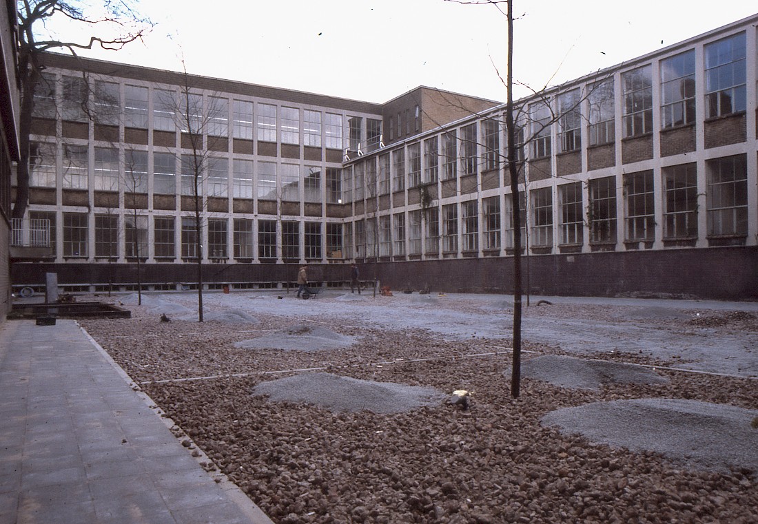 The KABK Courtyard, as it stands today is the outcome of UNILOCATIE renovation in 2000. In conversation with Ernst Bergmans in June 2021, I learnt about the development of both the KABK architecture and also of the courtyard and its local myths. Bergmans, who supervised the renovation project by Van Mourik Architects in 2000, is also an avid historian and careful archivist of photos and stories, which formed over his 40 years, as part of the KABK community, as a student, staff member, teacher, interim head in almost all departments, and lastly as a key team member and fundraiser for the KABK UNILOCATIE project. Bergmans kindly shared his experiences and insights into the architectural developments over the centuries. He confirmed the purpose of the stones, of which I had received various different stories and ideas, one suggesting that the stones were remnants of local buildings destroyed in World War II, and therefore monumental and impossible to remove, a story perhaps created, I may never know. In fact the stones are former houses and buildings, rubble of demolished buildings, a pragmatic (cheap) solution for tight budget, at the end of a long renovation project. The Courtyard as it stands today was intended for use by students, to present artworks and the grid system made of concrete tiles, just seen in the photo shows areas where the art works might be placed.