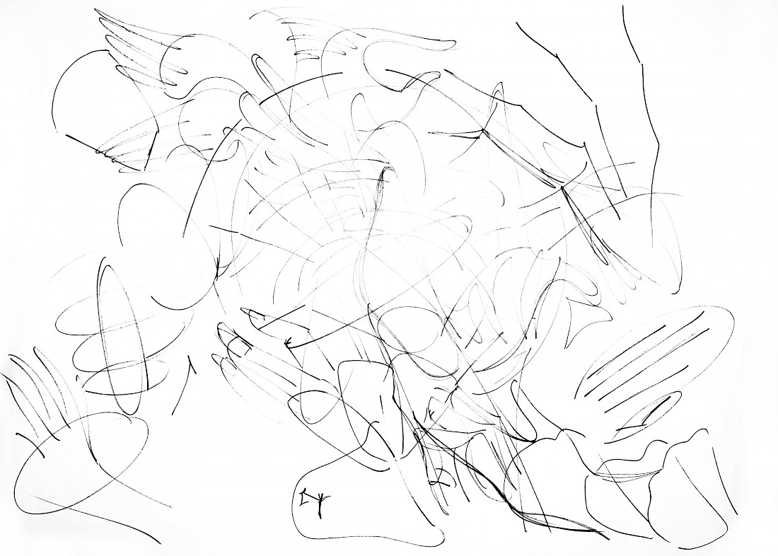 Therefore the class was split in teams of two whereas one person of each team performed while the other one documented the event. Within those teams person 1 was given the task to imagine a box around one particular body part or joint of their choice (f.i. wrist, shoulder, neck, chest, hips, knees, ankles,...) and to only move inside this restriction and a general radius of 1,5m for about ten minutes. Person 2 was assigned to observe their team partner and to translate their movements into a drawing. Besides the physical method of drawing this part also included developing an eye for the emotional interactions that person 1 has with their body. In doing so person 2 was invited to also note down words that associate with how they perceived person 1's body language (f.i. liberating, hasty, intimate, frustrated,...).