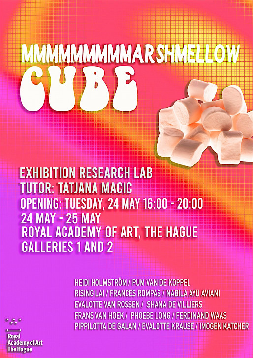 In the framework of the Exhibition Research Lab course within the Art Research Programme set-up by the Lectorate Art, Theory & Practice, students of the Royal Academy of Art (BA KABK) and students of the Leiden University (BA and MA), have created the exhibition Mmmmmmmmmarshmallow Cube.